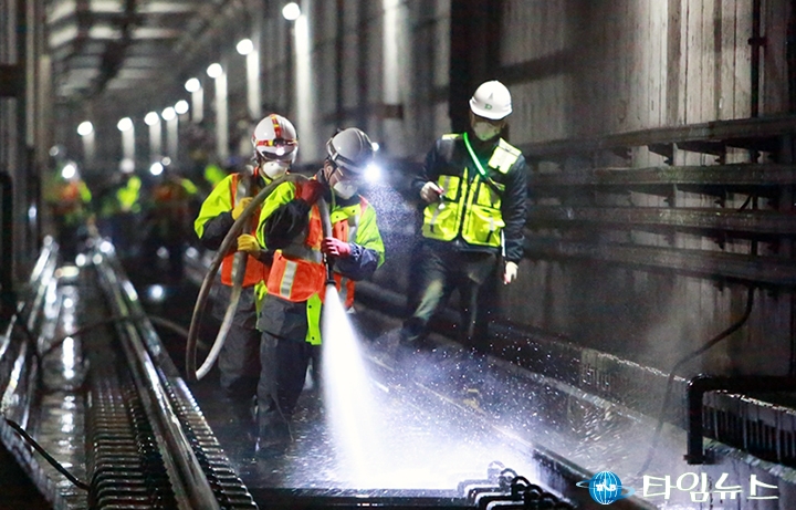 [대전타임뉴스=홍대인 기자] 대전교통공사는 3월부터 7월 말까지 도시철도 본선 터널 전 구간을 대상으로 물청소 작업을 진행한다. 이번 작업은 해빙기 이후 증가하는 미세먼지와 오염물질 제거를 위해 추진됐다. 공사는 연 2회 정기 청소를 통해 터널 환경을 관리하고 있다. 청소에는 연간 약 8만 톤의 지하수를 재활용해 약 1억5000만 원의 비용 절감 효과를 기대하고 있다. 이광축 사장 등 경영진은 현장을 점검하고 작업 안전과 공정 상황을 확인했다. 공사는 전기집진장치 도입 등 공기질 개선 기술도 함께 추진 중이다.