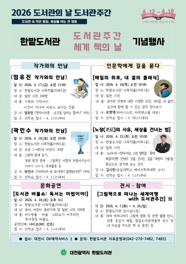 [대전타임뉴스=홍대인 기자] 대전 한밭도서관은 4월 12일부터 18일까지 도서관 주간과 23일 세계 책의 날을 맞아 독서문화 확산을 위한 프로그램을 운영한다. 이번 행사는 ‘도서관 속 작은 펼침, 세상을 여는 큰 열림’을 주제로 작가 강연과 공연, 전시 등으로 구성됐다. 4월 17일에는 엄유진 작가가 ‘기록과 기억 사이’를 주제로 강연을 진행한다. 18일에는 곽민수 작가와 그림책 읽기 프로그램이 마련된다. 같은 날 버블쇼 공연도 열린다. 전시 프로그램으로는 ‘그림책으로 떠나는 세계여행 展’을 통해 그림책 원화와 참여형 팝업도서관이 운영된다. 연계 행사로 16일 조현영 작가 강연과 23일 김시천 교수 인문학 강연도 진행된다. 한밭도서관 관계자는 도서관이 문화공간으로 자리매김하는 계기가 되길 기대한다고 밝혔다.