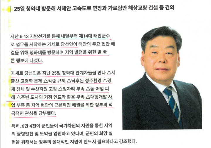 같은 시기인 2018년 6월 23일에는 주)태안풍력발전 법인이 설립됐다. 시간 순서를 고려할 때, 당선 직후부터 사업 추진 논의가 병행됐다는 해석도 가능하다.
