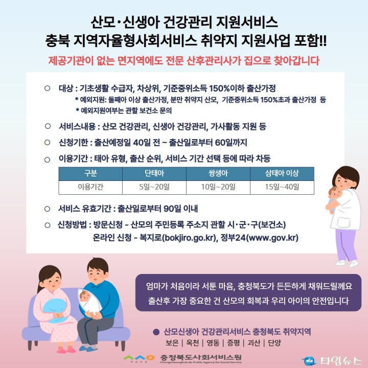 충북도는 지역별 인프라 현황에 대한 면밀한 분석을 바탕으로 서비스별 지원 대상 지역을 정밀하게 확정했다. 우선 아동·청소년 심리지원 서비스의 경우, 공급이 원활하지 않은 충주, 제천, 옥천, 영동, 괴산, 음성, 단양 등 7개 시·군의 외곽 면 지역을 중심으로 지원이 이뤄진다. 다만, 이미 자체 인프라가 충분히 갖춰진 충주 중앙탑면이나 음성 맹동면 등은 제외해 예산 집행의 효율성을 극대화했다. 또한, 제공기관이 전무해 산후조리 공백이 심각했던 보은, 옥천, 영동, 증평, 괴산, 단양 등 6개 시·군에는 산모·신생아 건강관리 서비스를 집중 투입해 저출생 위기 극복에 힘을 보탤 계획이다.