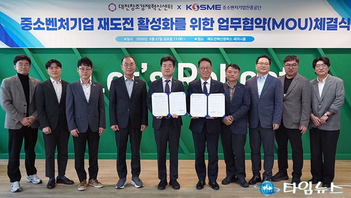 [대전타임뉴스=홍대인 기자] 대전창조경제혁신센터와 중소벤처기업진흥공단은 3월 27일 재도전 창업 지원을 위한 업무협약을 체결했다. 협약식은 대전 스타트업파크 재도전혁신캠퍼스에서 열렸으며, 관계자 10여 명이 참석했다. 양 기관은 재도전 지원 정책 연계와 인프라 공동 활용을 통해 재창업 기업의 재기와 성장을 지원하기로 했다. 성실경영평가 제도 연계, 교류 공간 제공, 지원 프로그램 협력, 성공 사례 발굴 등 분야에서 협력을 추진한다. 오는 4월부터는 대전 재도전 지원 사업에 성실경영평가를 도입해 행정 부담을 줄이고 지원 효율성을 높일 계획이다. 대전혁신센터는 재도전혁신캠퍼스를 활용한 교류와 협의회 운영을 통해 현장 소통도 강화할 방침이다. 박대희 대표는 “재창업자들이 다시 도전할 수 있는 기반을 마련하겠다"고 말했다.