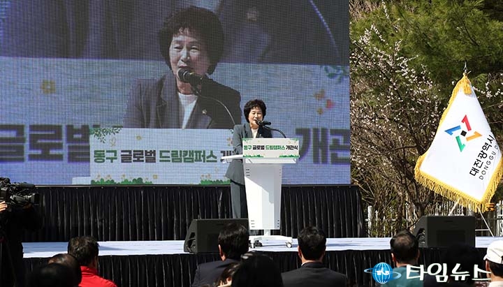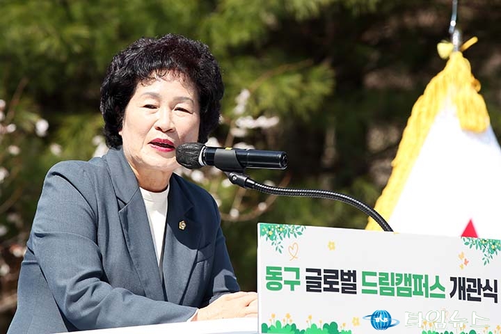 오관영 동구의회 의장이 28일 글로벌 드림캠퍼스 개관식에서 인사말을 하고 있다