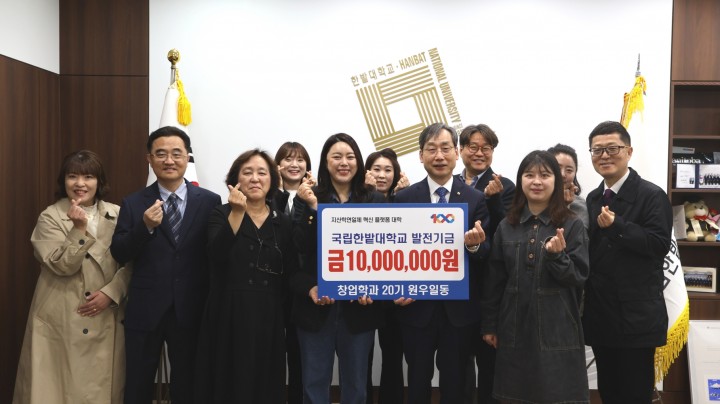 [대전타임뉴스=홍대인 기자] 국립한밭대학교 창업경영대학원 창업학과 20기 원우들이 1일 대학본부를 방문해 후배 지원과 창업 활성화를 위한 발전기금 1천만 원을 기부했다. 이날 행사에는 오용준 총장과 송우용 창업경영대학원장, 양영석 주임교수 등 교수진과 홍경선 원우회장 등 원우 약 12명이 참석했다. 홍경선 원우회장은 “재학 시절 받은 혜택을 후배들에게 돌려주고자 참여했다"며 “모교와 학과 발전에 지속적으로 힘을 보태겠다"고 말했다. 오용준 총장은 “발전기금 기부가 이어지는 창업학과 문화에 감사하다"며 “우수 인재 양성과 학과 발전을 위해 지속적으로 지원하겠다"고 밝혔다.