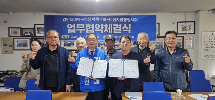 [대전타임뉴스=홍대인 기자] 김안태 대전 대덕구청장 예비후보가 대전지방행정사회와 정책협약을 체결하고 행정서비스 혁신과 취약계층 지원 강화를 추진하겠다고 밝혔다. 김 예비후보는 지난 3월 31일 대전지방행정사회와 협약을 맺고 행정 접근이 어려운 취약계층 지원과 행정 사각지대 해소를 위한 협력체계를 구축했다. 양측은 행정서비스 질 향상을 위한 공동사업과 행정사 교육·훈련, 취약계층 연계사업, 현장 중심 정책 발굴 등 다양한 분야에서 협력하기로 했다. 특히 행정사의 현장 경험을 활용해 복잡한 행정 절차로 어려움을 겪는 주민 지원과 지역 행정 안전망 구축에 중점을 둘 계획이다. 김안태 예비후보는 “구민이 체감하는 행정과 소외 없는 행정을 만들겠다"며 “정책 설계와 실행 경험을 바탕으로 행정 문턱을 낮추겠다"고 말했다. 박노귀 대전지방행정사회장은 “행정서비스 전문성과 접근성을 높이기 위해 협력하겠다"며 “행정 사각지대 해소에 힘을 보태겠다"고 밝혔다. 김 예비후보는 간호조무사협회와 요양보호사협회, 물리치료사협회 등과 정책협약을 이어가고 있으며 문화예술계와 대중교통 종사자 등과 간담회를 통해 정책 기반을 확대하고 있다고 설명했다.