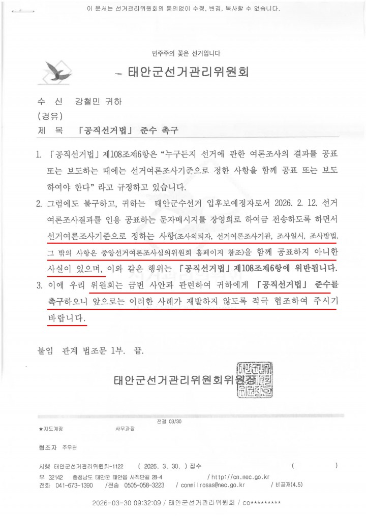이어 “해당 사안은 선관위로부터 ‘공직선거법 준수 촉구’ 조치로 마무리된 것으로, 이는 재발 방지를 위한 행정적 안내 수준일 뿐 위법 확정이나 처벌과는 전혀 다른 성격"이라고 밝혔다.또 일부 보도에서 여론조사 사안과 별개의 ‘비방 영상 고발’ 건을 함께 언급한 것과 관련해 “서로 다른 사안을 결합해 반복적인 위법 행위처럼 인식되도록 하는 것은 과도한 해석"이라고 주장했다.강 예비후보 측은 “비방 영상 관련 사안 역시 선관위로부터 허위사실 공표 및 비방죄에 해당하지 않는다는 취지의 답변을 받았다"고 덧붙였다.그러면서 “이 같은 보도가 군민 판단에 혼선을 줄 수 있다"며 “사실에 기반한 책임 있는 보도가 필요하다"고 강조했다.이어 “과장·왜곡 보도에 대해서는 엄정 대응할 방침이며, 필요 시 법적 조치도 검토하겠다"고 밝혔다.강철민 예비후보는 “정치적 공방이 아닌 정책과 실력으로 평가받겠다"며 “공정한 선거 문화를 지켜나가겠다"고 말했다.한편, 본지는 관련 사안에 대한 타 후보 측 입장을 확인 중이다.
