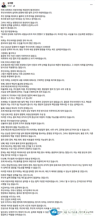 [대전타임뉴스=홍대인 기자] 주민자치회 설치와 운영을 위한 법적 근거가 국회를 통과한 가운데, 김석환 대전 중구의회 의원이 책임 구조 문제를 제기하며 제도 도입에 우려를 나타냈다. 행정안전부에 따르면 주민자치회 관련 규정을 ‘지방자치법’에 반영한 개정안이 3월 31일 국회 본회의를 통과했다. 이에 따라 시범 운영 단계였던 주민자치회는 본격 시행 기반을 갖추게 됐다. 주민자치회는 읍·면·동 단위에서 주민이 마을계획 수립과 예산 제안 등에 참여하는 조직으로, 2024년 말 기준 전국 1,641개 지역에서 운영되고 있다. 김 의원은 1일 페이스북에서 “제도 도입을 반대한 것이 아니라 준비되지 않은 시행을 막기 위한 것"이라며 “주민 의견 수렴과 의회 협의가 충분하지 않았다"고 밝혔다. 이어 “조례 통과와 예산 반영 과정에서 일부 민원과 단체 중심 여론이 의회를 압박하는 방식으로 작용했다"고 주장했다. 김 의원은 특히 권한과 책임의 불균형을 핵심 문제로 지적했다. 그는 “주민자치회가 정책 결정에 준하는 기능을 수행하지만 법적 책임 구조가 명확하지 않다"며 “결정은 주민자치회가 하고 책임은 행정이 지는 구조가 될 수 있다"고 말했다. 또 “추천 중심 위원 구성은 특정 조직과 인맥 중심 운영으로 이어질 수 있다"며 대표성 문제를 제기했다. 아울러 “행정업무 협의와 사무 수탁 기능은 행정과 충돌할 수 있다"며 “권한 중복과 비효율 가능성이 있다"고 밝혔다. 재정 구조에 대해서도 “예산은 확대되지만 성과 평가와 책임 환수 체계는 부족하다"고 지적했다. 주민총회 의사결정 방식과 관련해서는 “참석자 과반 의결 구조는 일부 의견이 전체 주민 의사로 반영될 가능성이 있다"고 말했다. 김 의원은 “법적 근거가 마련됐다고 해서 곧바로 시행할 수 있는 것은 아니다"며 “주민자치는 결과로 평가받아야 한다"고 강조했다. 이어 “충분한 숙고와 검증을 통해 주민에게 책임지는 제도를 만들어야 한다"고 밝혔다.