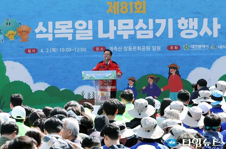 [대전타임뉴스=홍대인 기자] 이장우 대전시장은 2일 “중앙정부 심의로 사업이 3년 반 지연됐다"고 밝혔다. 이장우 시장은 계족산 장동문화공원에서 열린 제81회 식목일 행사에서 “주차장을 400면 이상 확보하려 했지만 중앙정부 심의 과정에서 축소됐다"며 “시민에게 꼭 필요한 사업이 늦어졌다"고 말했다. 이어 “이런 구조 때문에 빠르고 신속한 사업 추진이 어렵다"며 “도시는 대전 시민과 함께 만들어가는 만큼 지방분권이 필요하다"고 강조했다. 또 “81년 전 심은 나무가 지금까지 이어지며 대한민국 녹지를 만들었다"며 “시민들의 참여가 오늘의 환경을 만든 것"이라고 말했다.
