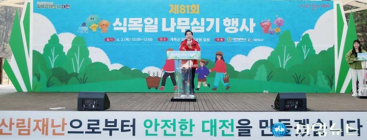 전석광 대덕구의회 의장이 2일 계족산 장동문화공원에서 열린 식목일 행사에서 인사말을 하고 있다