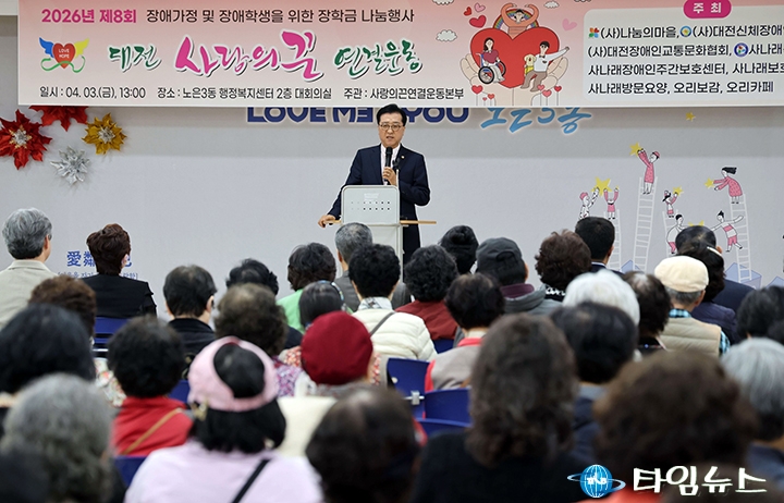 [대전타임뉴스=홍대인 기자] 조원휘 대전시의회 의장은 3일 ‘2026 대전 사랑의 끈 연결운동’에 참석해 장애 가정 학생 30명 결연과 장학금 지원을 강조했다. 이날 행사에는 후원자와 봉사자 등 187명이 참석했다. 학생들은 사회 각계 인사와 자매결연을 맺고 장학금을 지원받았다. 조 의장은 “10년 넘게 이어진 이 운동은 나눔과 연대의 상징"이라며 “학생들 뒤에는 항상 응원하는 연결이 있다"고 말했다. 이어 “시의회도 소외 없는 복지 도시를 위해 정책 지원에 힘쓰겠다"고 밝혔다. 이 운동은 장애 가정 학생과 각계 인사를 연결해 진로와 생활을 지원하는 사업으로, 2016년 이후 지속되고 있다.