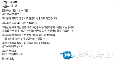 [대전타임뉴스=홍대인 기자] 더불어민주당 대전시장 경선이 결선으로 넘어간 가운데 장철민 후보는 토론을 제안하고 허태정 후보는 승리를 강조하며 맞붙었다. 더불어민주당 중앙당선거관리위원회에 따르면 대전시장 후보 선출을 위한 본경선은 4월 2일부터 4일까지 사흘간 진행됐다. 경선은 권리당원 선거인단 50%와 안심번호 선거인단 50%를 합산하는 방식으로 실시됐다. 경선 결과 장철민 후보와 허태정 후보가 결선에 진출했으며 장종태 후보는 탈락했다. 결선투표는 상위 2명을 대상으로 4월 11일부터 13일까지 사흘간 진행된다. 장철민 후보는 페이스북에서 “허태정 후보에게 결선 토론회를 제안한다"며 “늦어도 4월 8일까지 추가 토론회가 필요하다"고 밝혔다. 이어 “시간과 장소, 진행 방식은 상대 후보 결정에 따르겠다"고 말했다. 또 “장종태 후보와 유능한 통합연대로 손을 잡았다"며 “대전의 더 큰 미래를 열겠다"고 강조했다. 허태정 후보는 페이스북에서 “검증된 경험과 실력으로 끝까지 승리하겠다"며 “흔들림 없이 나아가겠다"고 밝혔다. 그는 장종태 후보에 대해 “더불어민주당의 소중한 자산"이라고 평가했다. 결선을 앞두고 토론 여부와 선거 전략을 둘러싼 양 후보 간 경쟁이 본격화되고 있다.