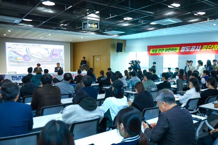 [대전타임뉴스=홍대인 기자] 한남대학교는 국가철도공단이 캠퍼스를 관통하는 500m 구간 고속철도 선형개량사업을 재개하자 공사 강행에 반발하고 있다. 국가철도공단은 한남대 종합운동장 일대를 지나는 지하 190m, 개착 310m 등 총 500m 구간 선형개량을 추진하고 있다. 이 과정에서 운동장 스탠드와 레슬링장, 테니스장, 재활용 분리장 등 시설 철거가 포함됐다. 해당 사업은 2022년 터널 출입구 경사 문제 등 안전성 논란으로 중단됐으나, 2023년 9월 공단이 대학과 협의 없이 재개를 고시한 것으로 알려졌다. 한남대는 지하 4~12m 구간을 고속열차가 통과할 경우 소음과 진동, 지반 약화로 인한 안전사고를 우려하고 있다. 연약지반 통과와 공사 기간 중 장기간 공사물 적체도 위험 요인으로 지목했다. 또 캠퍼스혁신파크 인접 구간에 열차가 통과할 경우 연구시설과 입주기업의 소음 피해와 안전 문제가 발생할 수 있다는 입장이다. 대학 측은 재설계와 안전대책 수립을 요구했으나 받아들여지지 않았다고 밝혔다. 사업 승인 유예 요청 역시 국토교통부와 국가철도공단이 시공사 협의를 이유로 수용하지 않은 것으로 전해졌다. 교수와 직원, 학생들은 서명운동과 국민권익위원회 진정, 민원 제기를 진행하고 있으며, 교내에는 공사 반대 현수막이 게시됐다.