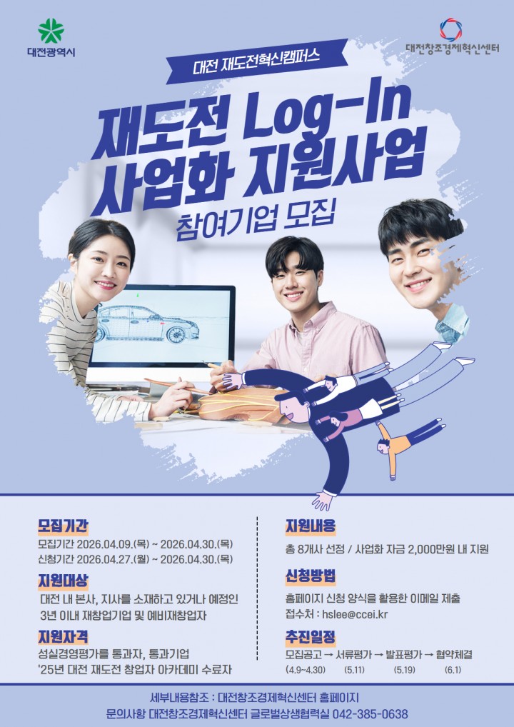 [대전타임뉴스=홍대인 기자] 대전창조경제혁신센터는 재창업 기업 8개사를 선정해 최대 2000만 원을 지원하는 사업을 추진한다. 지원 대상은 대전에 본사를 둔 재창업 3년 이내 기업과 예비 재창업자다. 아카데미 수료생이나 성실경영평가 통과 기업이 신청할 수 있다. 지원금은 시제품 제작, 특허 등 무형자산 취득, 마케팅 비용 등에 사용된다. 코워킹 공간 제공과 IR 연계, 융자 지원도 함께 진행된다. 모집은 4월 9일부터 30일까지이며 접수는 27일부터 30일 오후 4시까지 이메일로 받는다. 서류와 발표 평가를 거쳐 최종 선정한다. 박대희 대표이사는 “재창업 기업의 재도약을 지원하겠다"고 말했다.
