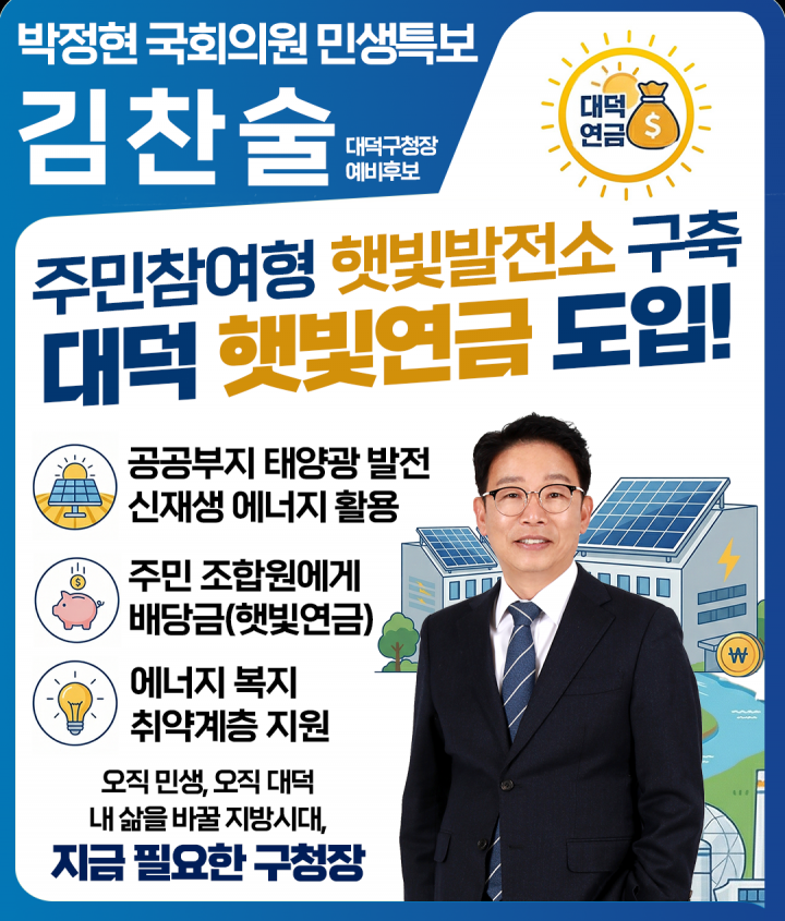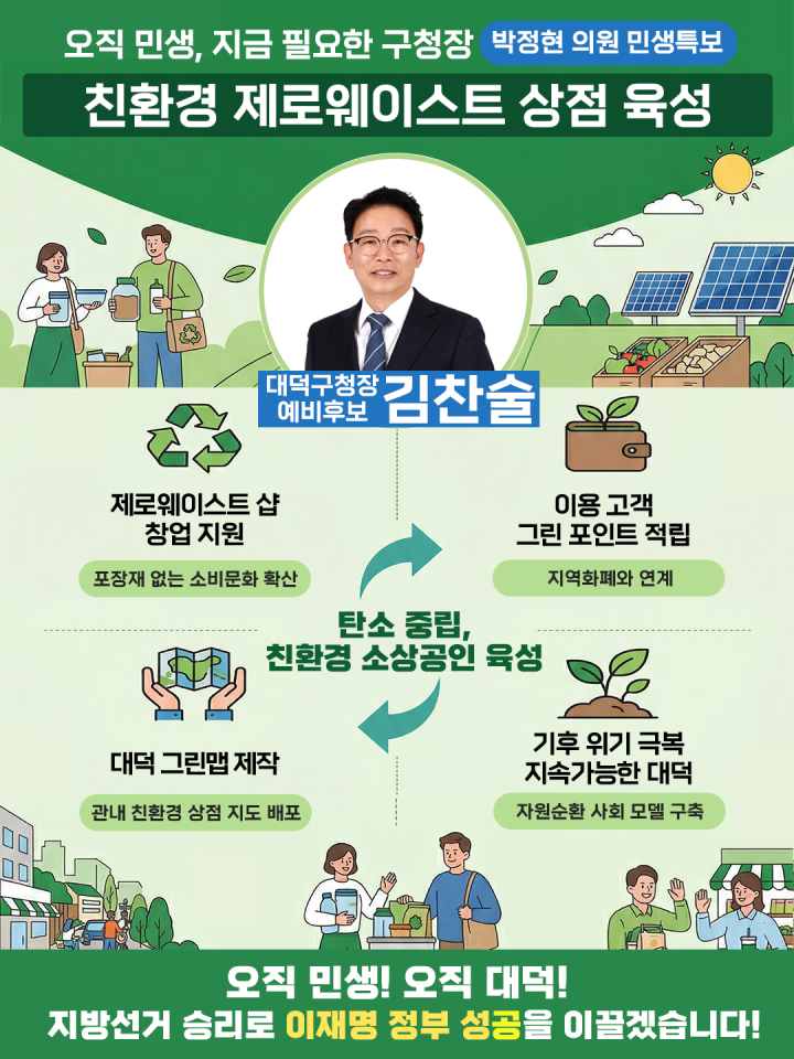 [대전타임뉴스=홍대인 기자] 김찬술 대전 대덕구청장 예비후보는 13일 제로웨이스트 정책과 태양광 기반 ‘햇빛연금’을 결합해 주민 수익을 확대하는 순환도시 구상을 발표했다. 쓰레기 감축과 에너지 생산을 동시에 추진하는 구조다. 김 예비후보는 이날 “지속가능한 도시는 생활 속 변화와 지역 자원 활용에서 시작된다"며 “주민이 참여하고 직접 체감할 수 있는 구조를 만들겠다"고 밝혔다. 제로웨이스트 정책은 리필 스테이션 확대와 친환경 제품 판매점 확산을 통해 포장재 사용을 줄이는 데 초점을 맞췄다. 제로웨이스트 상점 이용 시 지역화폐 포인트를 추가 적립하는 ‘그린 포인트’ 제도와 ‘대덕 그린맵’도 도입할 계획이다. 또 제로웨이스트 상점 창업 시 인테리어와 홍보비를 지원하고, ‘대덕형 제로웨이스트’ 인증 기준을 마련해 정책을 확산한다는 방침이다. 에너지 분야에서는 공공기관 옥상과 유휴부지 등에 태양광 발전시설을 설치하고 주민 조합 방식으로 운영하는 ‘대덕 햇빛발전소’를 추진한다. 발전 수익은 ‘햇빛연금’ 형태로 주민에게 배당하고 일부는 에너지 취약계층 지원에 활용할 계획이다. 김 예비후보는 “쓰레기를 줄이는 생활과 에너지를 나누는 구조는 결국 같은 방향"이라며 “생활과 경제가 함께 순환하는 도시를 만들겠다"고 말했다.