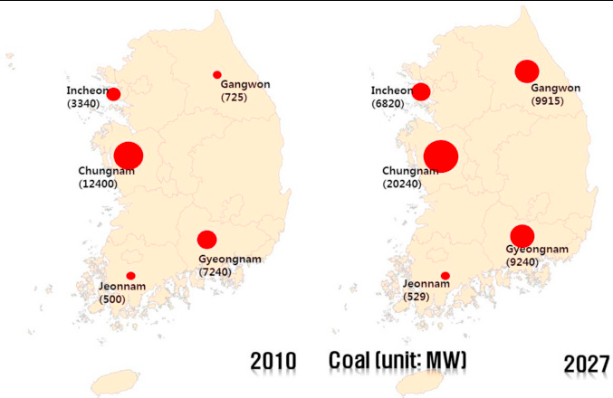 [2010년 대비 2027년 충남 전기 발전량] =출처: 한국-미국 공동 프로젝트인 KORUS‑AQ (Korea-U.S. Air Quality Study)=]
