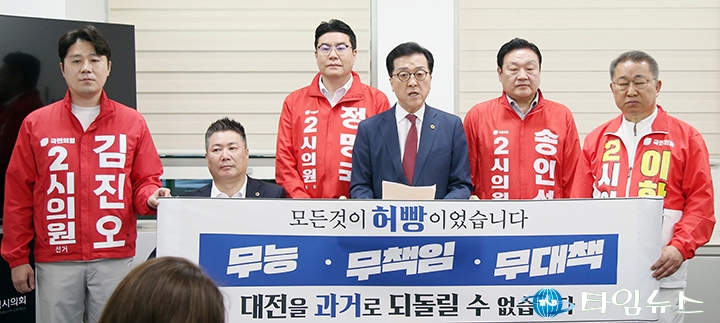 [대전타임뉴스=홍대인 기자] 조원휘 대전시의회 의장이 14일 허태정 더불어민주당 대전시장 후보를 향해 “도시철도 비용 1조 원 증가 책임부터 사죄하라"며 정면 공세에 나섰다. 조원희 의장은 이날 시의회 기자실에서 국민의힘 대전시의원 일동 명의 성명을 대표 발표하며 “허태정 후보 공천을 환영한다"면서도 “민선7기 4년 시정의 과오와 책임을 시민 앞에 분명히 해야 한다"고 밝혔다. 조 의장은 민선7기 시정을 “무능·무기력·무대책 3무 시정"으로 규정하고 도시철도 2호선 사업비가 7,492억 원에서 1조 5,069억 원으로 증가했다고 지적했다. 이어 유성복합터미널, 갑천호수공원, 베이스볼드림파크 등 주요 사업 지연을 문제로 제기했다. 또 “허 후보가 경선 과정에서 민선8기 시정 성과를 폄훼하고 자신의 과오에 대해 무책임한 태도로 일관했다"고 주장했다. 조 의장은 민선8기 시정 성과와 관련해 산업단지 조성, 기업 유치, 상장기업 증가 등을 언급하며 “대전이 인구 감소에서 증가로 전환되는 성과를 냈다"고 밝혔다. 이어 “이장우 시정 성과를 인정하고 정책 경쟁에 임해야 한다"고 말했다. 중앙정치와 관련해선 “대전시장 선거를 중앙정부 들러리로 전락시키는 전략에서 벗어나야 한다"며 “시민 주권 중심 선거에 나서야 한다"고 강조했다. 대전충남 통합 문제에 대해서도 “민주당이 통합 법안을 무산시켰다"며 “허 후보는 이에 대한 입장을 밝히고 선거에 임해야 한다"고 했다. 경제 상황과 관련해선 “정부 정책 영향으로 지역 경제와 부동산 경기가 침체됐다"며 “시민이 체감하는 위기에 대한 해법을 제시해야 한다"고 밝혔다. 조 의장은 “이번 지방선거는 대전의 미래를 좌우하는 전환점"이라며 “시민 눈높이에 맞는 정책 경쟁에 나설 것을 촉구한다"고 말했다.