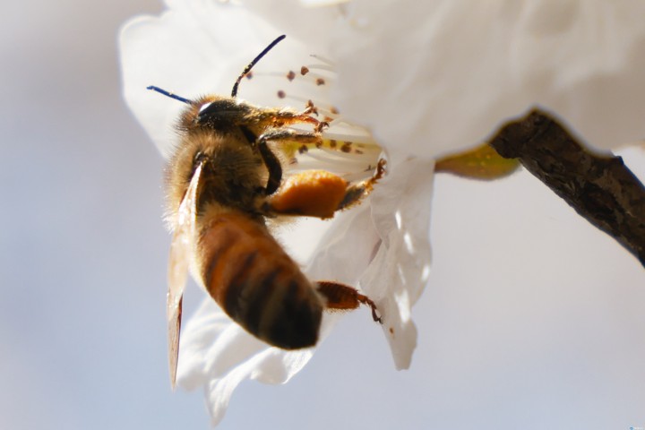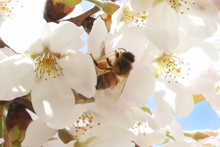 [충북타임뉴스=한정순 기자] 충북 한낮 기온이 25도까지 올라 포근한 봄을 맞은 가운데, 만개한 벚꽃 사이로 다리의 꽃가루 주머니를 가득 채운 꿀벌이 봄맞이 준비에 한창이다./충북도 제공