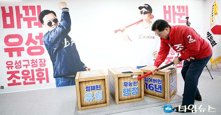 [대전타임뉴스=홍대인 기자] 대전 유성구청장 선거에 출마한 국민의힘 조원휘 후보가 “썩은 물을 엎겠다"며 “구청장이 직업이냐"고 직격하며 현 구청장의 3선 도전을 정면 비판했다. 조원휘 후보는 21일 유성구 대학로 선거사무소 개소식에서 “유성구는 지난 16년간 민주당 구청장이 행정을 맡아왔다"며 “현 구청장은 재선에 이어 4년을 더해 3선, 즉 12년을 하겠다고 한다"고 말했다. 이어 “4년은 짧을 수 있지만 8년이면 머릿속에 있는 것과 하고 싶은 것은 다 한다"며 “그동안 특별히 한 것도 없고 더 이상 새로운 아이디어가 나오겠느냐"고 반문했다. 그는 “지금 구청장에서 새로운 아이디어가 나오겠느냐"며 “3선을 하면 몸조심이나 하면서 정치적 돌파구만 찾게 될 것이고 결국 37만 구민의 세금과 시간만 낭비하게 될 것"이라고 말했다. 조 후보는 “유성을 사랑하는 유성 사람의 지지로 반드시 당선돼 썩은 물을 엎어버리고 맑고 깨끗한 유성으로 바꾸겠다"고 강조했다. 이날 개소식에는 당 관계자와 시·구의원, 지지자 등 300여 명이 참석했다. 행사에서는 ‘잃어버린 16년, 무능한 행정’ 문구가 적힌 상자를 부수는 퍼포먼스가 진행됐다.