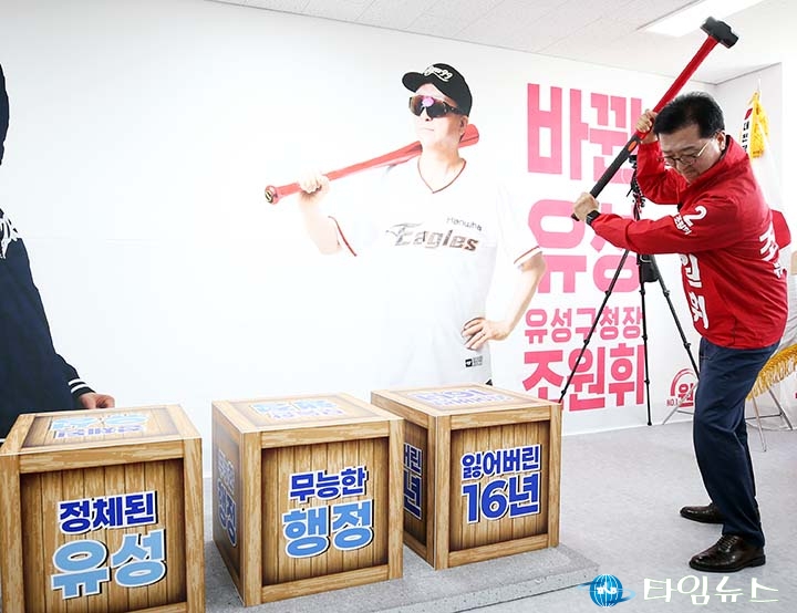 [대전타임뉴스=홍대인 기자] 대전 유성구청장에 출마한 조원휘 후보가 해머를 들어 ‘유성 16년’을 하나씩 깨부수는 장면을 연출했다. 조 후보는 21일 유성구 대학로 선거사무소 개소식에서 ‘잃어버린 16년, 무능한 행정, 정체된 유성구’ 문구가 적힌 상자 3개를 하나씩 내려치며 순차적으로 부수는 퍼포먼스를 진행했다. 해머를 들어 올린 뒤 망설임 없이 상자를 향해 내리쳤고, 상자가 부서질 때마다 현장에서는 박수와 환호가 이어졌다. 앞서 조 후보는 4월 7일 출마 선언에서 ‘선수교체’를 상징하는 야구방망이 퍼포먼스를 선보였다. 이번에는 해머를 들고 ‘교체’를 넘어 ‘격파’ 메시지를 강조했다. 이날 퍼포먼스는 유성구 행정에 대한 비판과 변화 의지를 시각적으로 드러낸 장면으로, 조 후보가 직접 참여해 현장 주목도를 높였다.