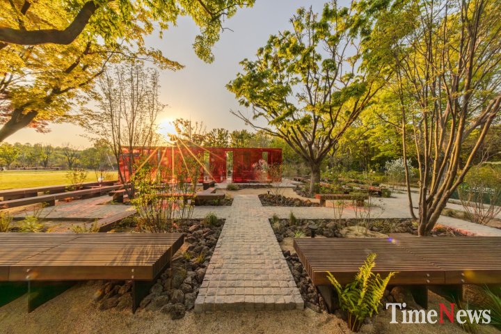 정원은 한국 전통 정원의 ‘마당’ 문화에서 영감을 받아 도심 속 휴식과 교류 공간으로 꾸며졌다. 파빌리온 외관에는 붉은 색 강화유리를 적용해 익숙한 풍경을 새로운 시선으로 바라볼 수 있도록 구성했다.
