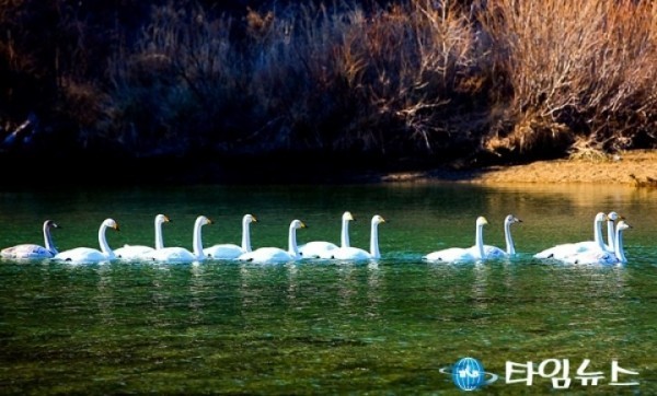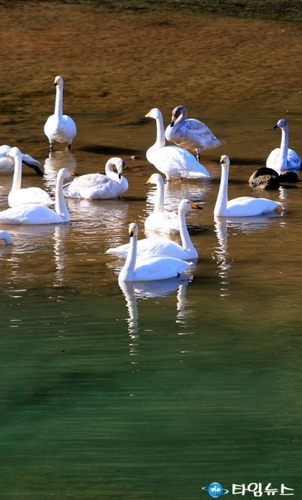 [울진타임뉴스=백두산기자]본격적인 한파가 시작된 지난 22일 울진군 근남면 왕피천 일원에 대표적인 겨울철새 고니(천연기념물 201호)떼가 날아들어 월동 준비를 하고 있다.