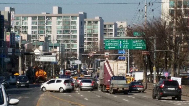 ▲ 수도관 파열로 인해 인근 1번 국도가 통제됐다.