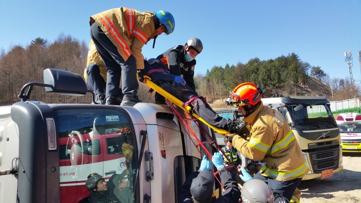 [태백=최동순] 태백시 사토장에서 트럭 전복 사고가 일어나 환자를 병원으로 이송하였다.
