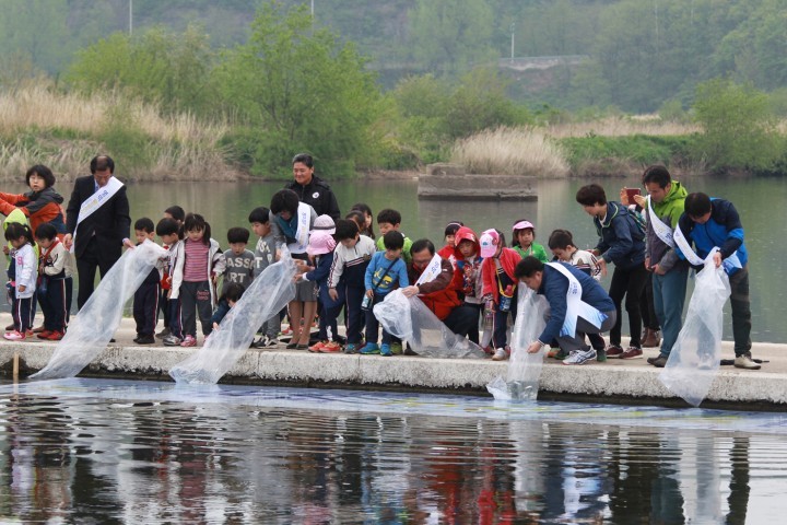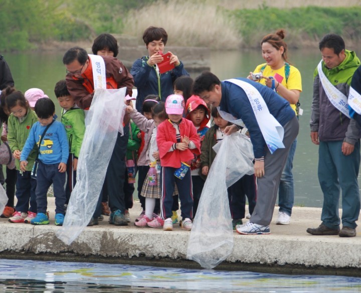 [영덕타임뉴스=백두산기자]영덕군(군수 이희진)은 4월 29일 영덕읍 오십천 일원에서 영덕읍 이장, 사회단체 및 어린이집 어린이 등 약 200여명이 참여한 가운데 ‘영덕황금은어’ 140만미를 방류했다.