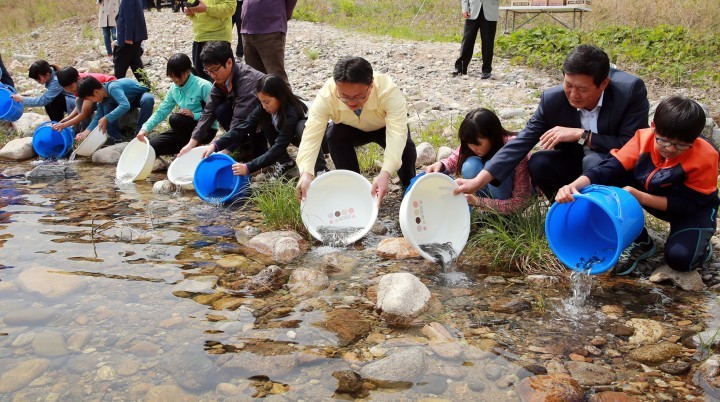 [울진타임뉴스=백두산기자]울진군은 지난 5월 7일에 청정1급수 하천인 왕피천에서 노음초등학교 학생들과 내수면 명예감시관 등 80여 명이 참석한 가운데 2015년 울진토속은어방류 행사를 가졌다.