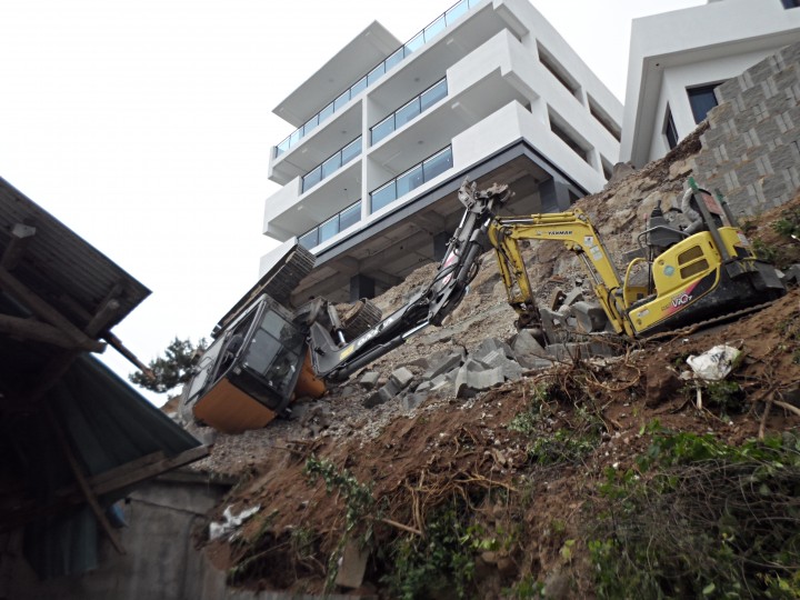 위 일시 장소에서 포크레인이 보강토블럭 위에서 펜션 공사를 하던 중 보강토블럭이 무너지며 포크레인이 3~4m 아래로 추락, 그 아래서 공사를 하던 피해자들이 깔리며 발생한 사고다.
