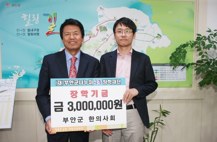 군은 부안군 한의사회 김수경 대표 등이 최근 군청을 찾아 김종규 나누미근농장학재단 이사장에게 “지역인재 양성을 위해 써 달라”며 장학금 300만원을 기탁했다고 밝혔다.