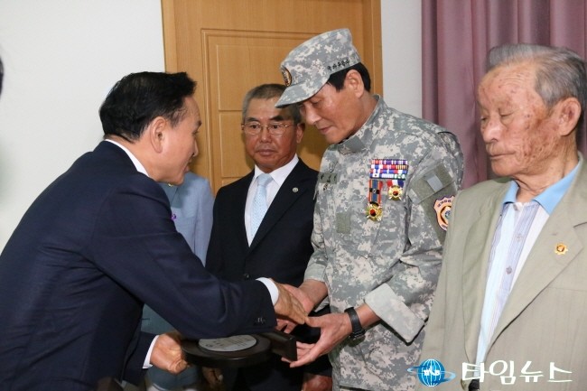 구본영 천안시장이 6.25참전 용사들에게 표창패를 수여하고 함께 하고 있다. [사진=최영진기자]