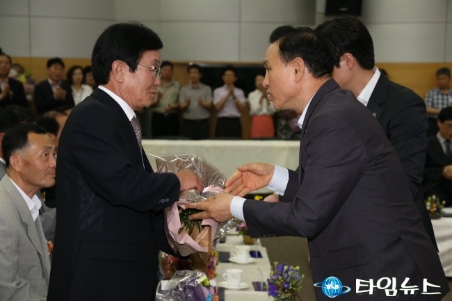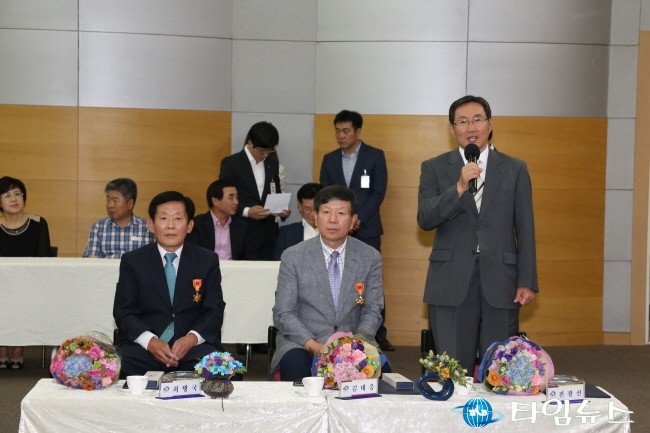구본영 천안시장이 퇴임하는 천안시 공무원에게 정부포상으로 박근혜 대통령 대신 훈장을 달아주고 있다 [사진=최영진기자]
