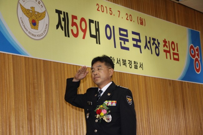 이문국 신임 천안서북경찰서장이 취임을 하고 있다. [사진=최영진기자]