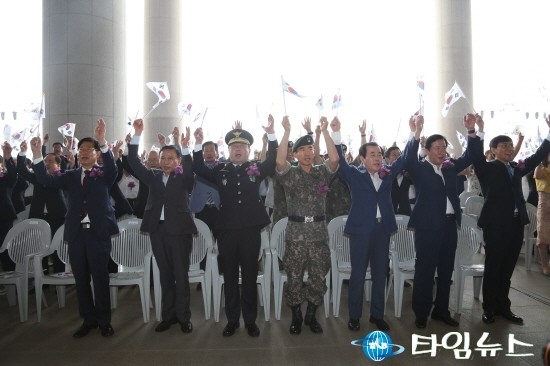 광복70주년 기념식에서 만세 삼창을 하고 있는 모습 [사진=최영진기자]