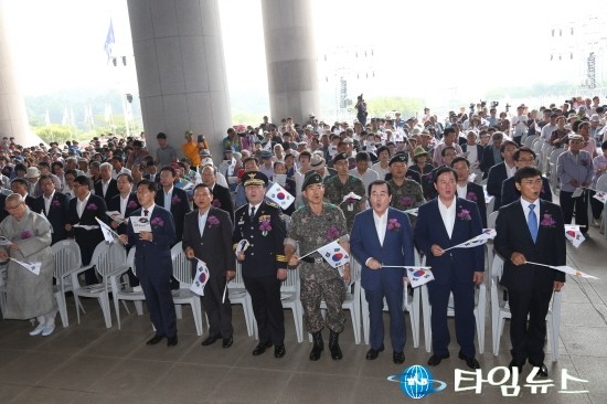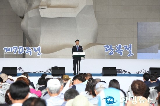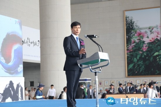 안희정 충남도지사가 천안독립기념관에서 관람객들과 함께 광복70주년의 의미를 되새기며, 경축사를 하고 있다. [사진=최영진기자]