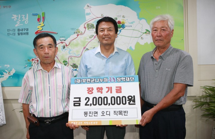 동진면 오디작목반 김종인 회장과 동진면 장신마을 이홍재 이장은 20일 군청을 찾아 김종규(부안군수) 나누미근농장학재단 이사장에게 “지역인재 육성과 교육복지 향상을 위해 써 달라”며 각각 장학금 200만원씩을 기탁했다.