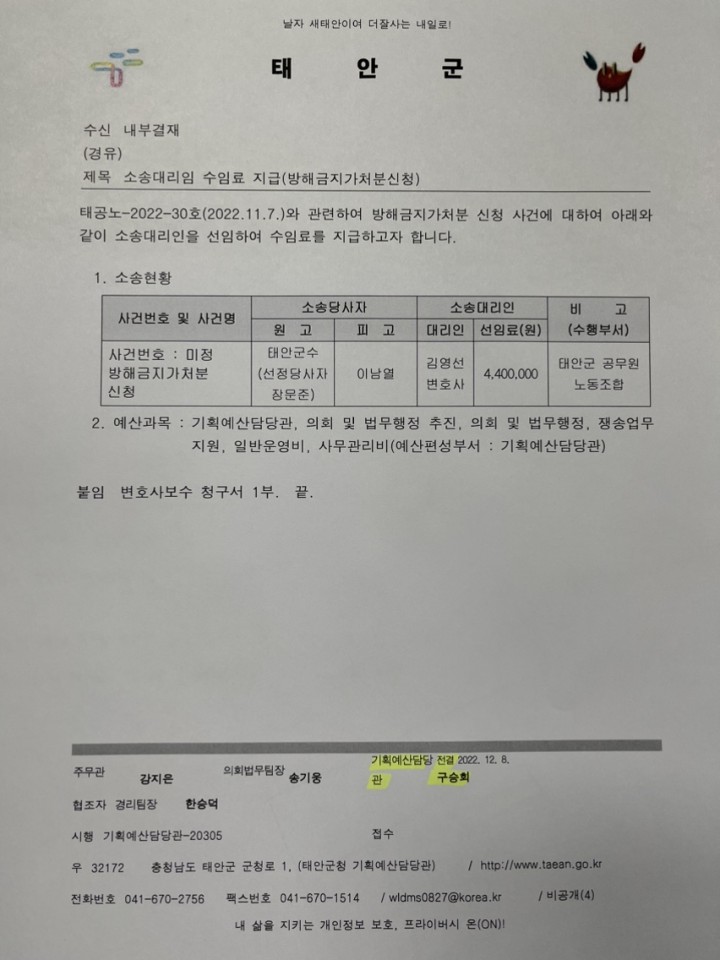 당시 변론 대리인 선임비는 태안군수 결제에 의해 약440여 만원 상당하는 혈세가 지급됬다면서 다음의 결정문을 6개월 후 확정받았다.